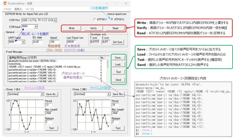 プリセットメッセージの設定は、AQUEST社が提供するアプリ PicoRomWriter(※1) を使えば、ホストPCからシリアル通信で簡単にできます。他にも、発話速度や文末無音長、チャイム音(2種類)を設定できます。
