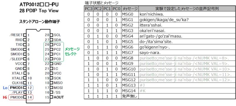 プリセットメッセージを使うには、動作モードを スタンドアロンモード (PMOD1端子:Lo,PMOD0端子:Hi) に設定します。スタンドアロンモードでは、メッセージセレクト端子のPC0~PC3いずれかに変化があった場合に、各端子の状態(下表)から発声するメッセージを確定して発声します。逆に言うと、セレクト端子の状態に変化が無ければ発声しないので、発声させるには外部から端子を操作する必要があります。