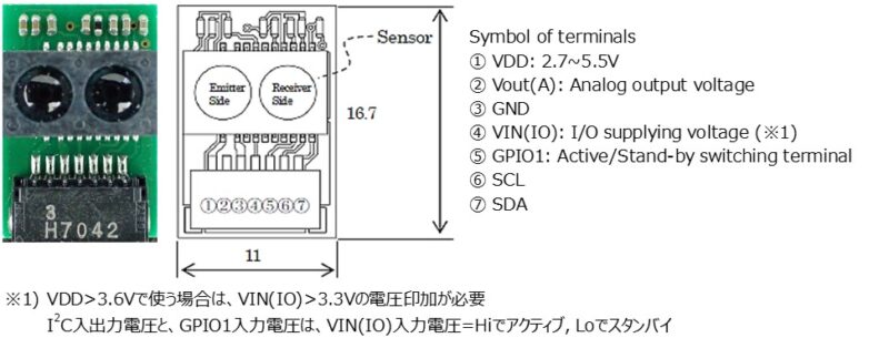 GP2Y0E03(SHARP)は、アクティブ型光学式測距センサーで、アナログとデジタル(I2C)の両出力に対応しています。下は、外観とコネクタのピンアサインです。サイズは11×16.7×5.2mmとコンパクトです。