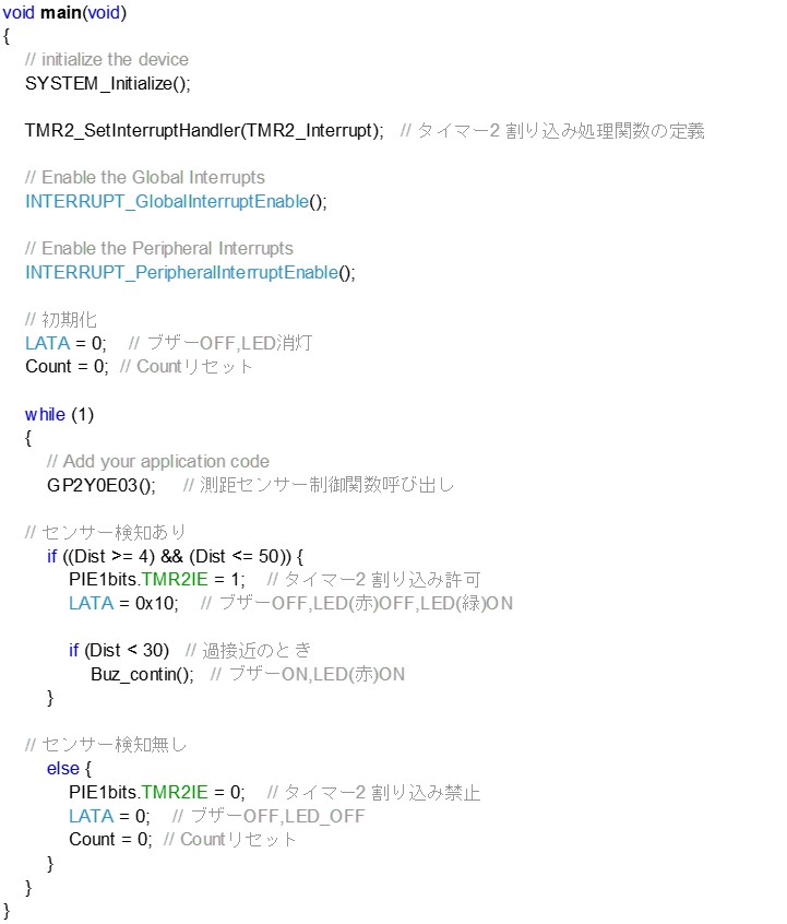 下は、ソースコードのメインループ部です(MCCを使用)。センサー測距値から検知あり/無しの処理を行います。