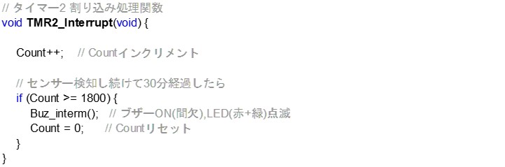 下は、タイマー2割り込み処理関数です。休憩時報の30分を生成する関数で、1分毎の周期割り込みを30回カウントした後ブザーとLEDを動作します。