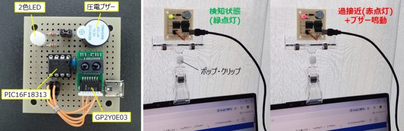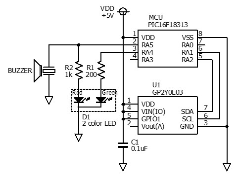 下は回路図です。電源は、USBバスパワーから5Vを給電します。また、ブザーの他に2色LEDの発光色で状態を表示します。表示色と状態は、緑点灯が検知あり,赤点灯が過接近,橙(赤+緑)点滅が休憩時報,消灯が検知なし。