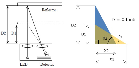下図は、測距の概要です。センサーモジュールは、LED(赤外線発光ダイオード)とDetector(検出器)から成り、LEDから発射された赤外線は、Reflectorに反射してDetectorのCMOSイメージセンサーで検出され、検出した受光スポット位置から三角測量法(※2)を基にReflectorまでの距離Dを計算します。測距距離(仕様値)は4~50cmで、リニアなセンサー出力特性です。